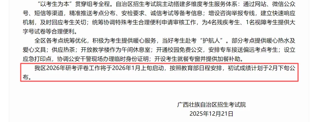 根据广西壮族自治区招生考试院发布的最新消息,2026年研考评卷工作将于2026年1月上旬启动,按照教育部日程安排,初试成绩计划于2月下旬公布。考场上,严守纪律、规范作答是保障考试公平公正的底线,也是每一位考生顺利完成考试的前提。此前多方反复提醒相关注意事项,但仍有部分考生不慎触碰红线。接下来,就让我们一同梳理考场上那些需要警惕的“雷区”。