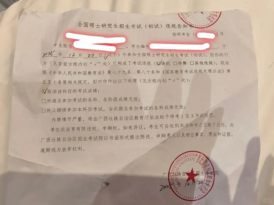 据考生考后反馈,有考生因赴考匆忙,误将机械手表带入考场。考试进行至后半程时,监考老师发现其桌面的手表并按规收缴,该考生在考试结束后签署了违规告知书,最终思想政治理论科目成绩被取消。