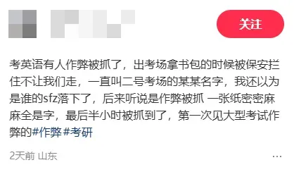 据考生反馈,同考点内有考生在英语科目考试期间涉嫌作弊,被监考人员当场查获并依规处理。