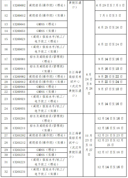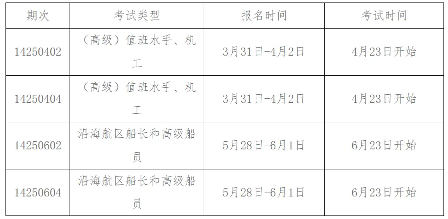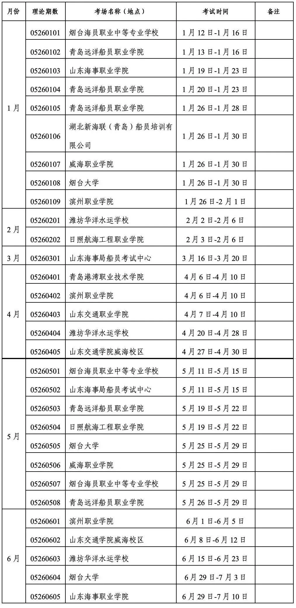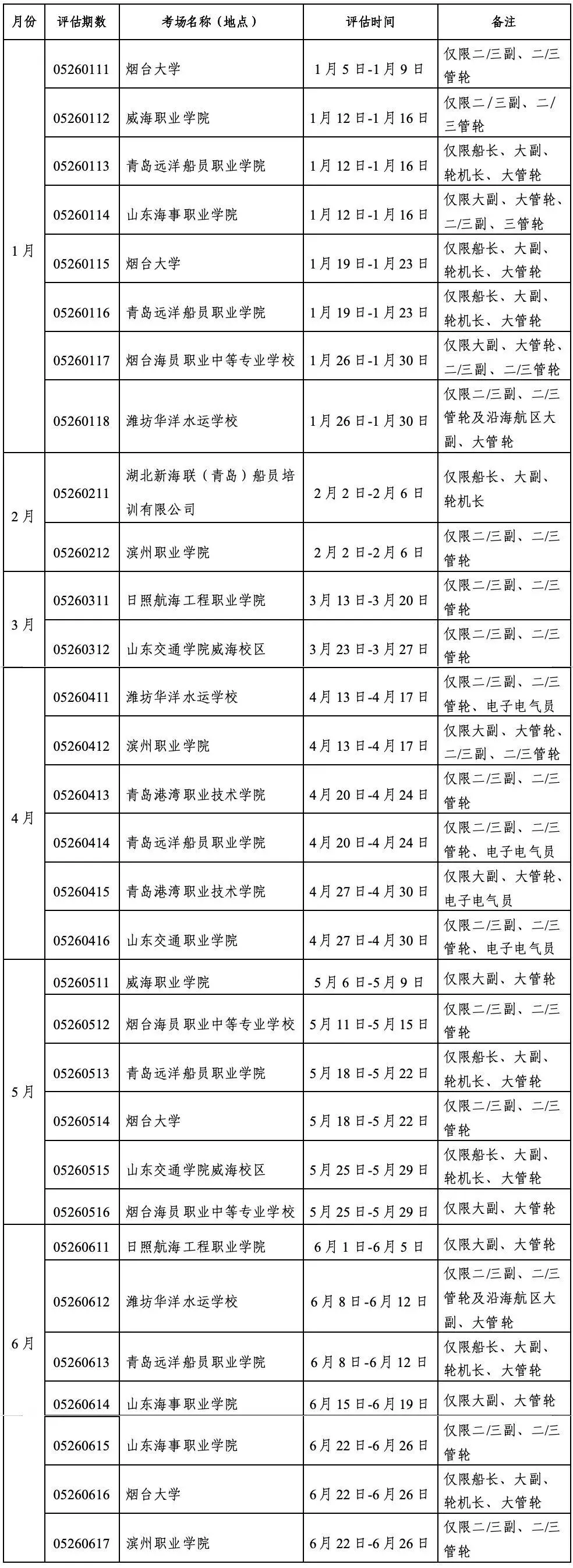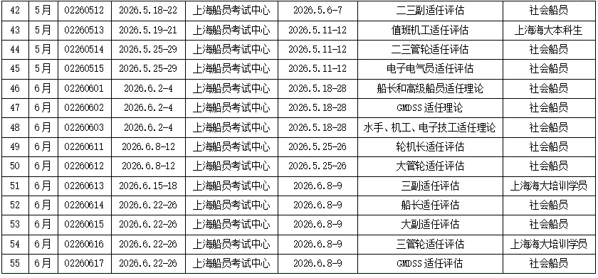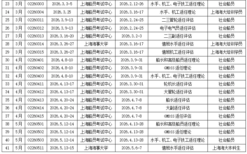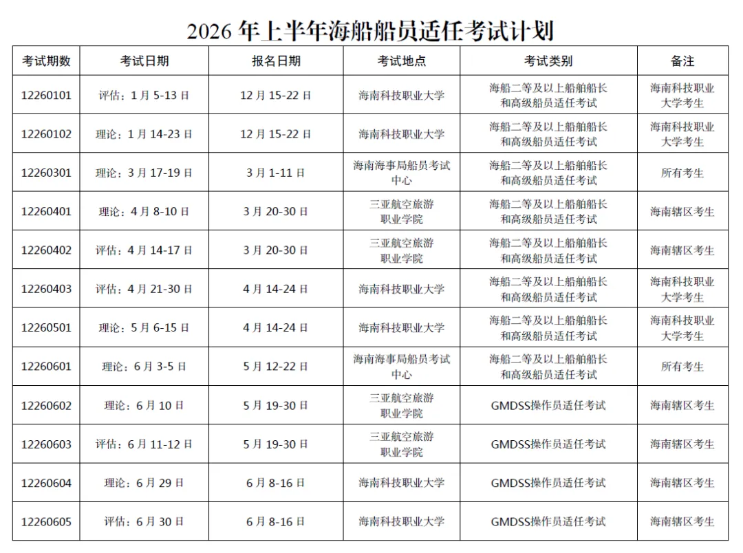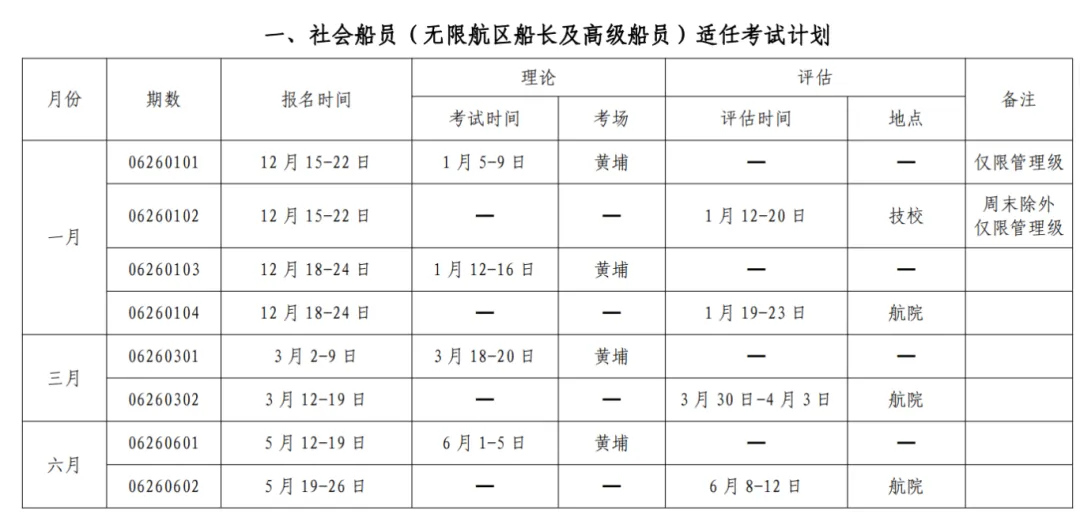2026年上半年管理级船员理论考试5期,适任评估4期。具体时间安排请见附件1。