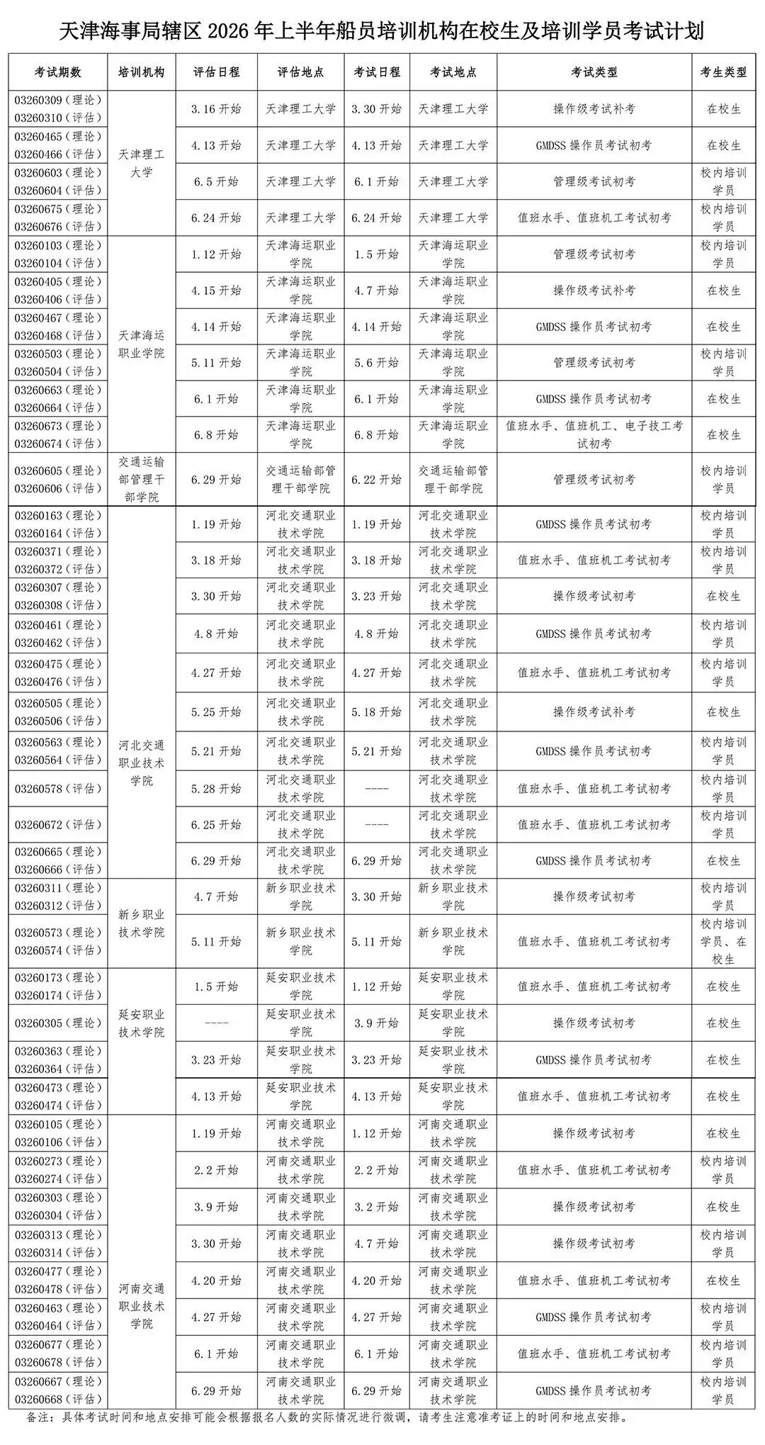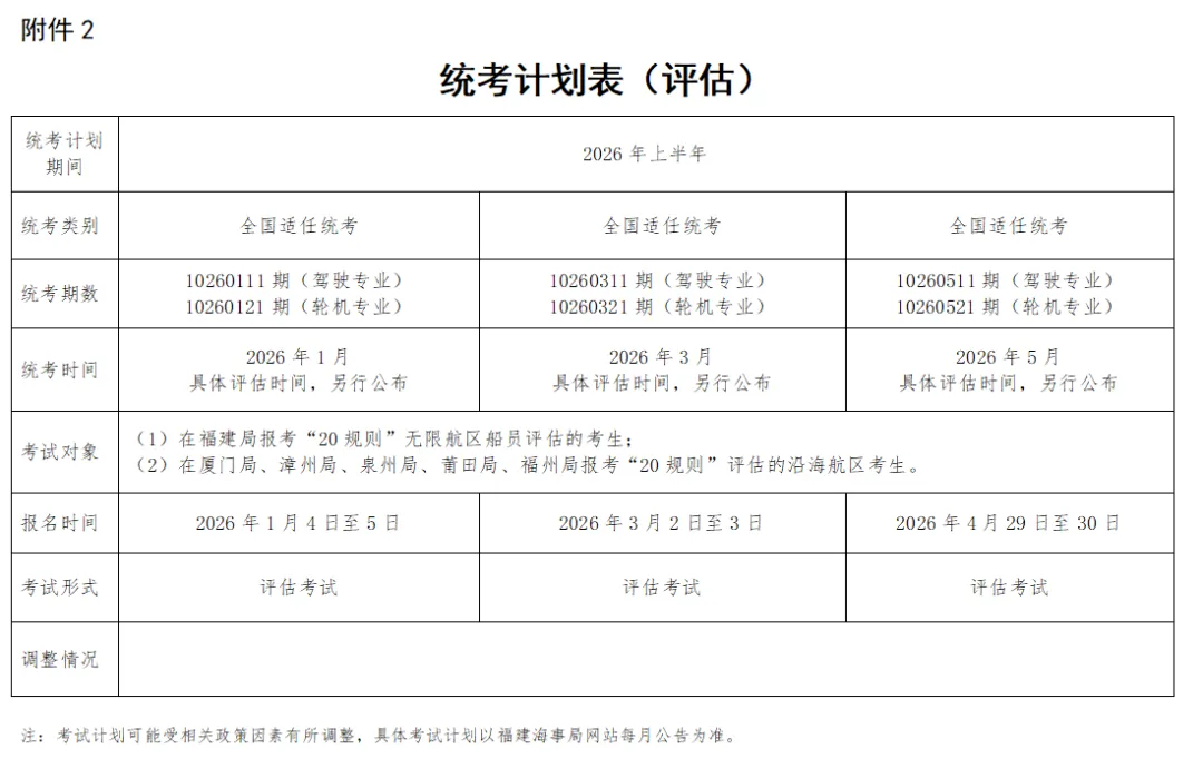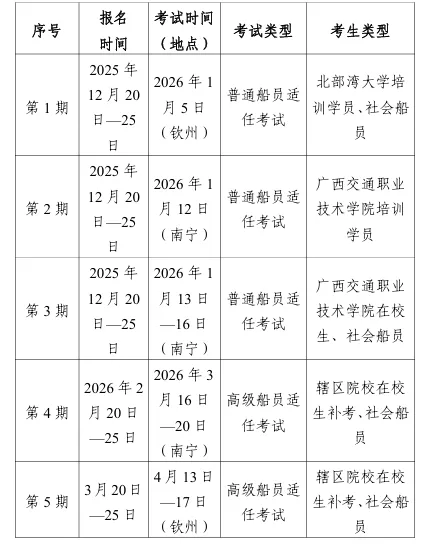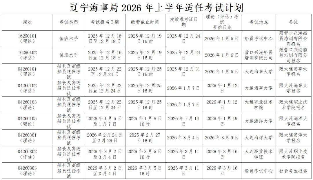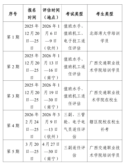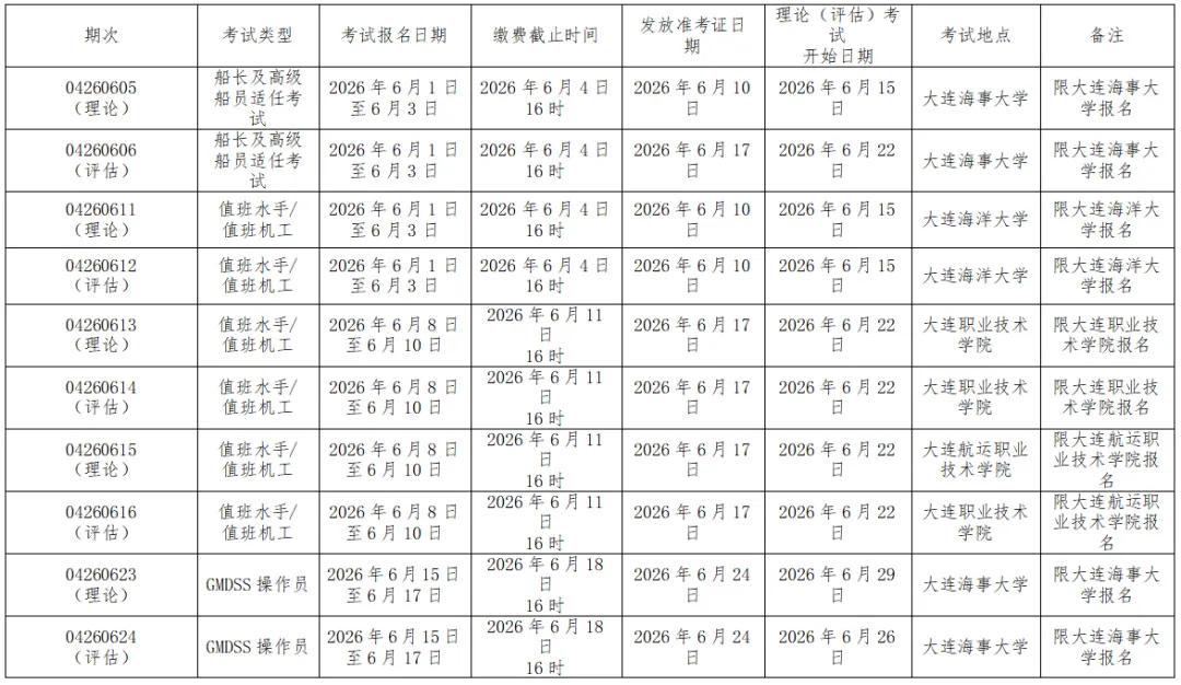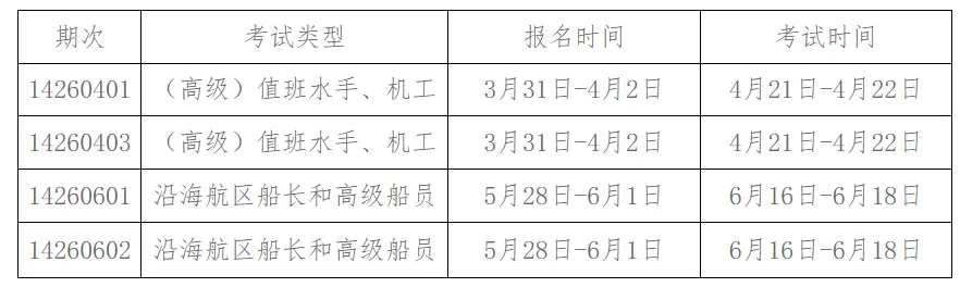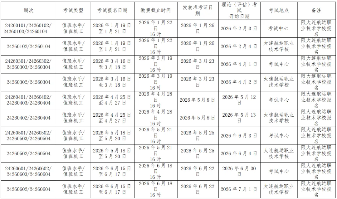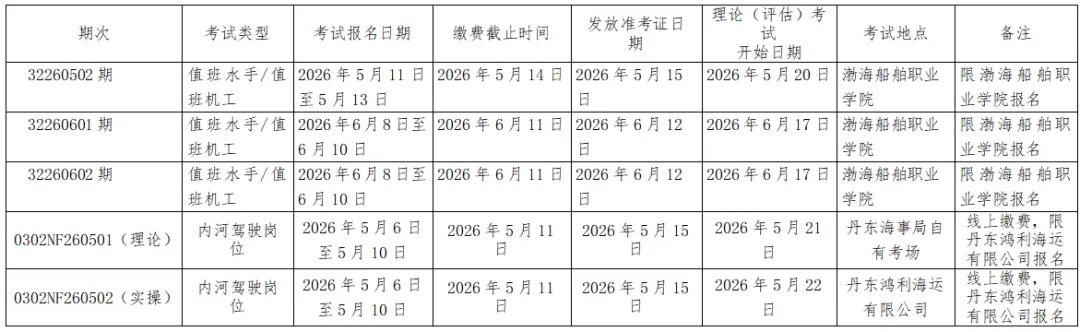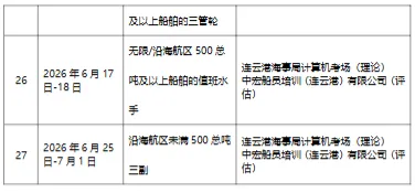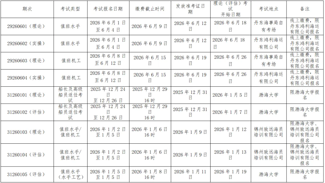 2026年上半年操作级船员理论考试2期,适任评估1期。具体时间安排请见附件2。