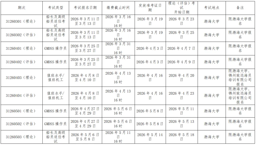 2026年上半年安排海船船员适任评估考试31期,具体安排如下: