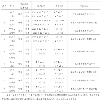 根据《中华人民共和国海船船员适任考试和发证规则》及有关规定,为做好船员适任考试工作,现将各直属海事局2026年上半年船员考试最新计划汇总如下,供查阅参考。