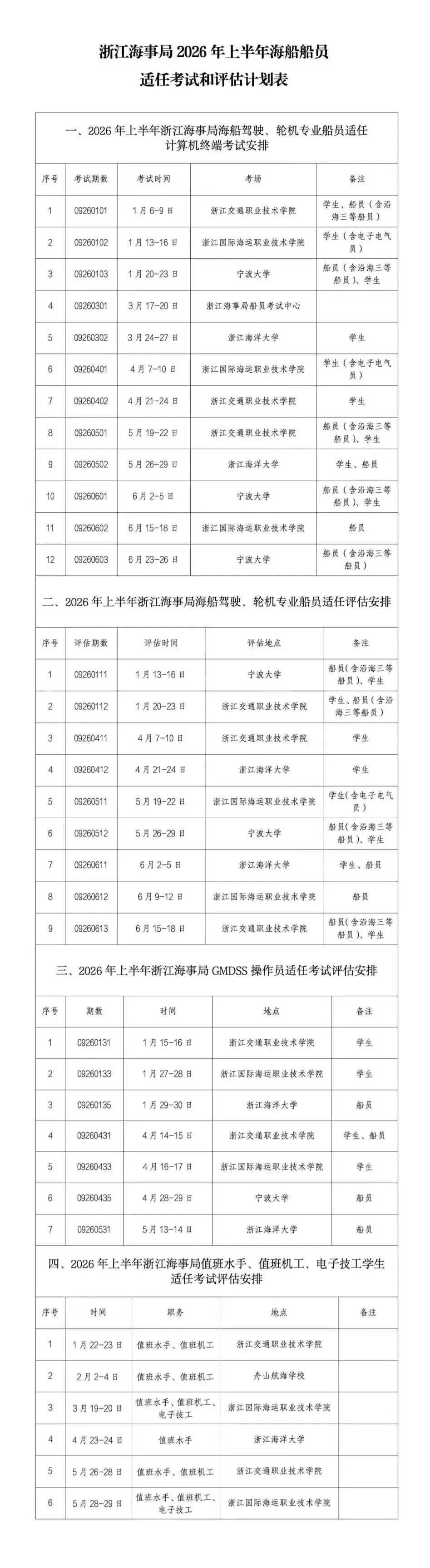 浙江海事局2026年上半年海船船员适任考试和评估计划
