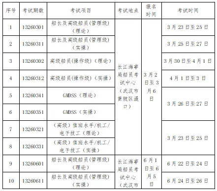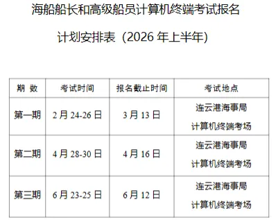 1.时间安排:2026年上半年共举办3期海船船长和高级船员适任理论考试,全部采取计算机终端进行,具体考试安排如下: