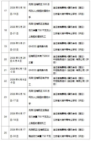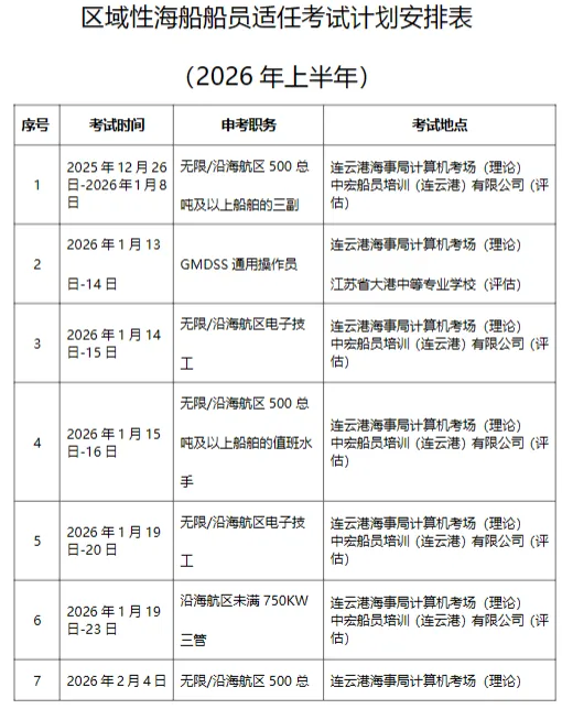 连云港海事局2026年上半年辖区海船船员适任考试计划