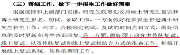 重庆师范大学在3月26日发布的研究生院工作简报第2期中称,要做好复试三种预案:第一,传统复试;第二,线上复试;第三,传统复试和线上复试相结合方式。