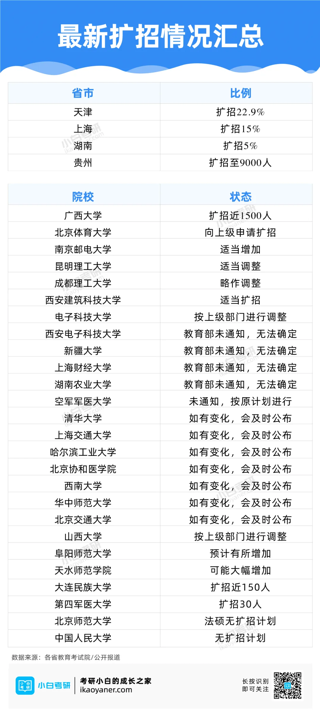 截至目前,各省市、院校硕士研究生招生最新扩招情况汇总如下: