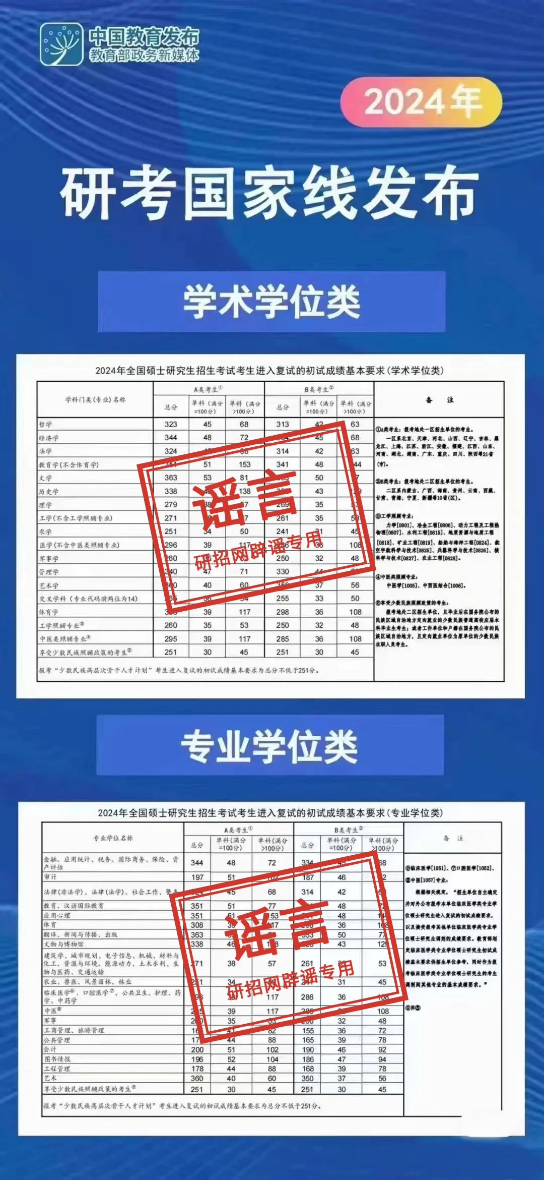 2024年全国硕士研究生招生考试国家分数线已公布。近日,有网民P图伪造所谓的“2024年研考国家线”(见下图),并在网上传播,其内容严重失实,严重误导广大考生和社会,对网络造谣者予以严厉谴责!提醒广大考生以教育部官方网站公布的信息为准,不信谣、不传谣。