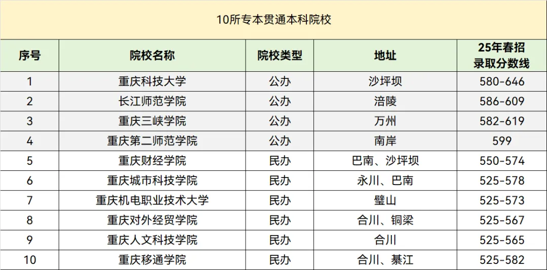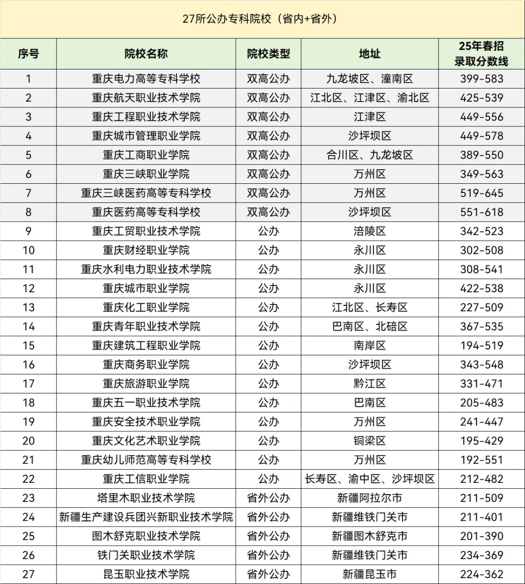 重庆高职分类考试(又称“春招”)作为重庆考生升学的重要路径,覆盖本科与专科院校,涵盖专本贯通、双高计划、公办专科等热门类型。今天学长就来给大家盘点一下25年春招全部招生院校的录取分数线和院校地址!