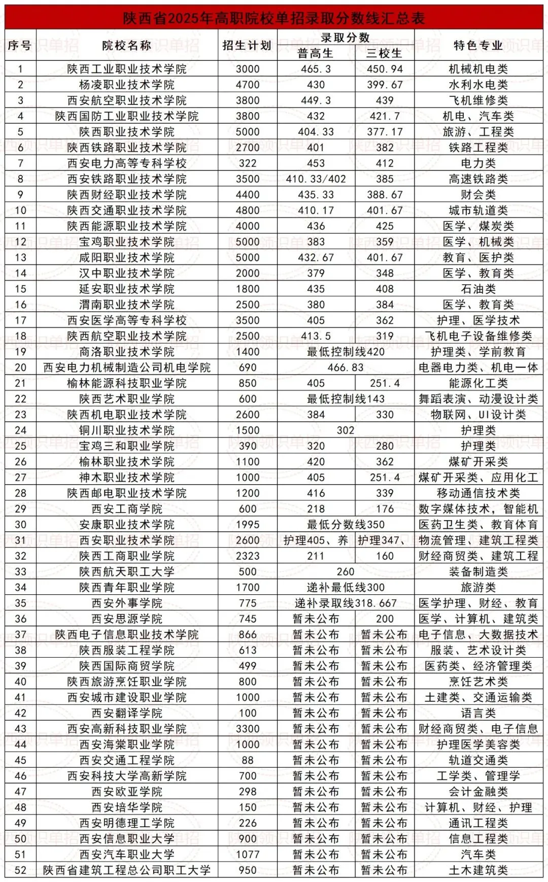 陕西财经职业技术学院:普高426分,三校生382分陕西铁路工程职业技术学校:普高369分,三校生338分陕西省2025年单招院校总招生人数98167人