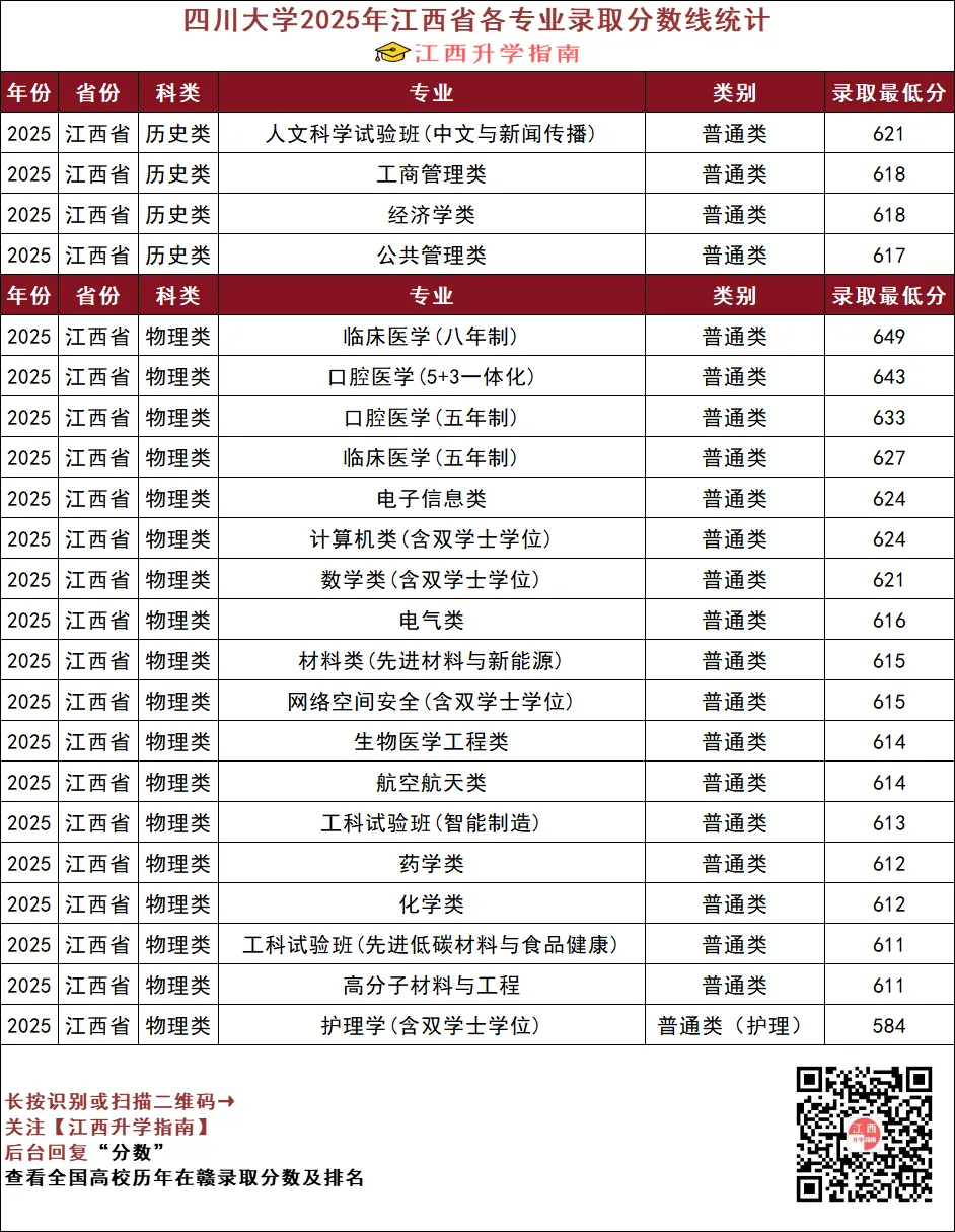 >四川大学2025年江西省各专业录取分数线统计!