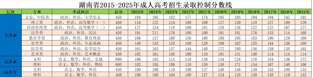 小编还整理了近11年湖南省成人高考最低录取分数线: