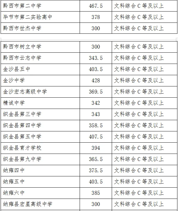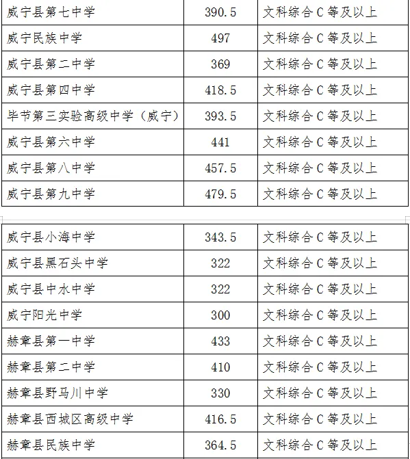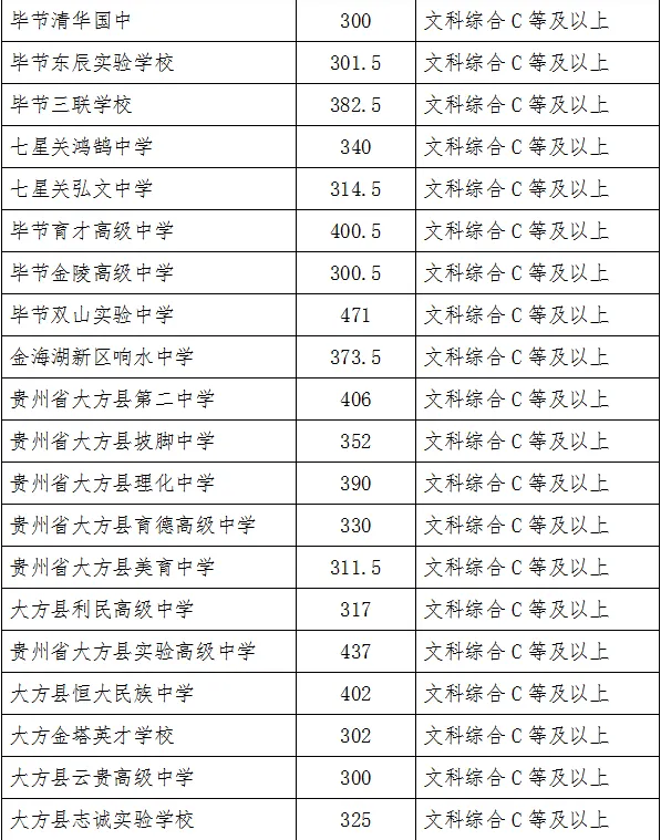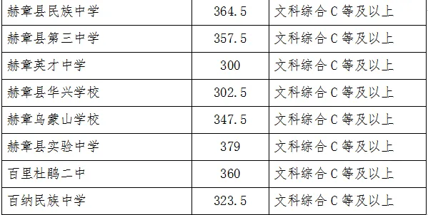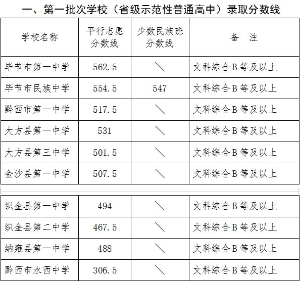 毕节市招生考试管理中心关于2022年普通高中招生录取分数线的公告根据《毕节市招生委员会关于认真做好2022年初中毕业生升学考试和普通高中招生工作的通知》(毕市招委〔2022〕1号),全市普通高中招生录取严格按照“分数优先、遵循志愿、一次投档”的原则进行,已划定各批次普通高中学校最低录取分数线,现予公布:三、全市普通高中最低录取控制线:300分。毕节市招生考试管理中心2022年7月12日