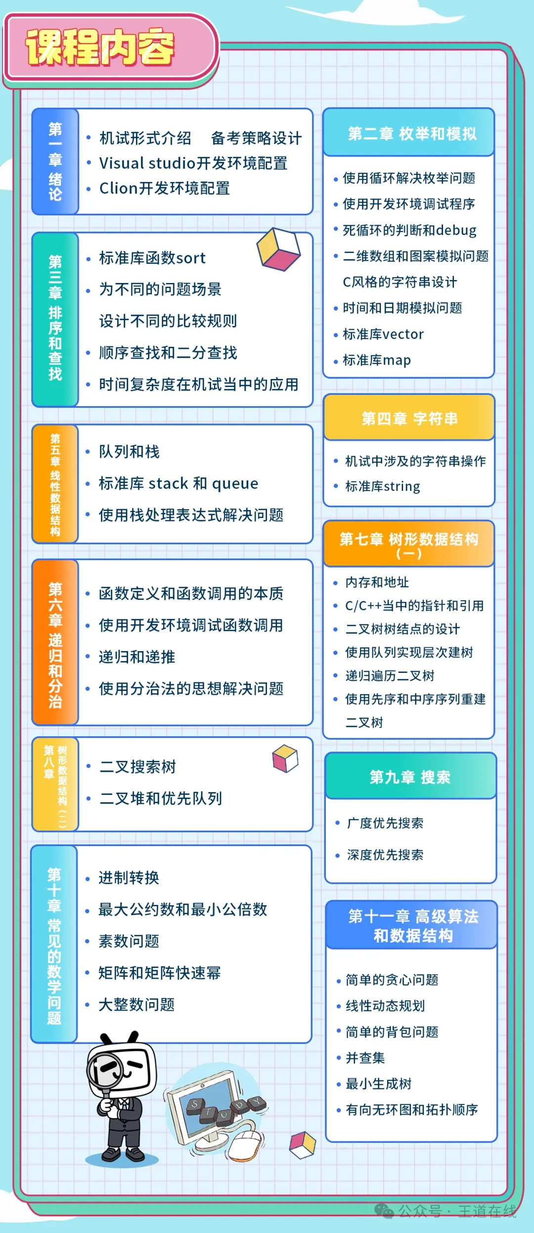 总结:机试课沿用王道一贯的授课风格,采用“讲”、“学”、“练”结合的模式,相较于教材内容更加丰富,增加补充知识点、常用编码技巧等,帮助考生由点及面地全方位提升编程能力。王道计算机考研复试机试课是系统讲授计算机考研机试的辅导课程,一共有9个章节,由浅入深地讲解机试相关考点,并精选名校复试上机题作为课程习题,手把手给考生提供编程指导。- 王道线下训练营人气讲师,教学经验丰富;代码讲解通俗易懂,逻辑清晰,深受学生喜爱。