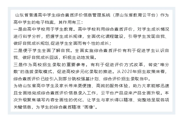 山东省普通高中学生综合素质评价信息管理系统记录学生成长点滴,更是巧妙搭建起通往多元升学路径的坚固桥梁。家长、同学们抓紧熟悉起来,用好平台,为高中生活添彩、为升学助力!要是实操遇难题、细节存疑问,随时与咨询老师进行交流,焦老师团队祝各位考生录入顺利。