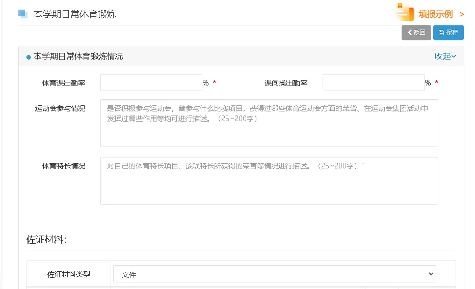 研究性学习及创新成果必填项为课题研究和项目设计,每学期各上传一个内容即可,需针对理论学习情况、承担任务、研究内容、成果概述等内容进行填写,并在佐证材料处上传研究性学习报告+证书。