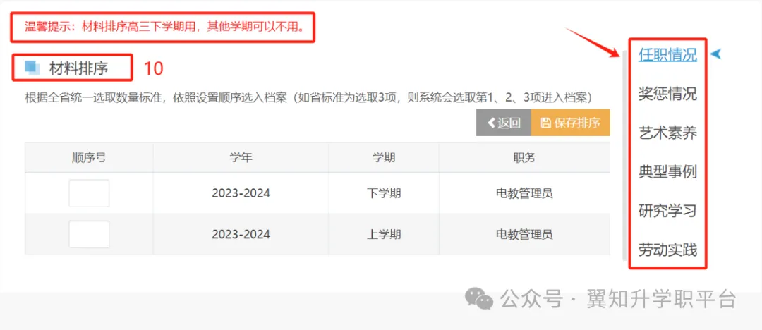 规划师会根据添加资料含金量进行优先级排序;需要注意的是此模块高三下进行即可,其他学期可以不用,但不能显示无,点击保存排序即可。