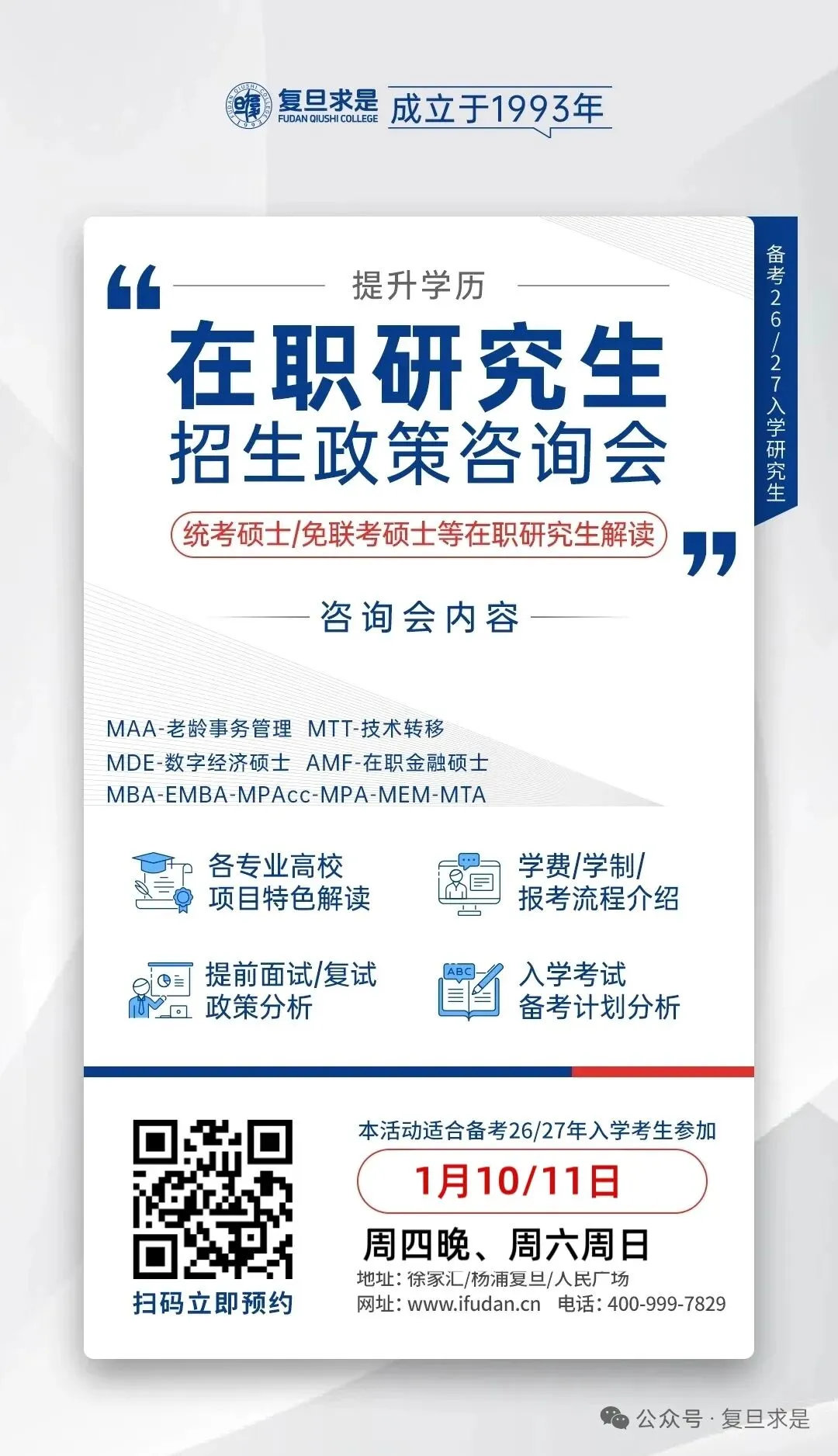 近期不少考生同学咨询在职人士如何快速提升学历,一方面在职备考时间更加紧、信息纷乱,不同专业优势如何?申请流程有何不一样?对于在职考研的人来说,现在正是针对2026年考研制定详细备考计划的关键时刻。为了帮助大家理清报考信息,帮助迷茫的你找到合适的备考方向,选择性价比和含金量都较高的项目;本周末复旦求是特举行2027入学研究生备考规划政策讲座。