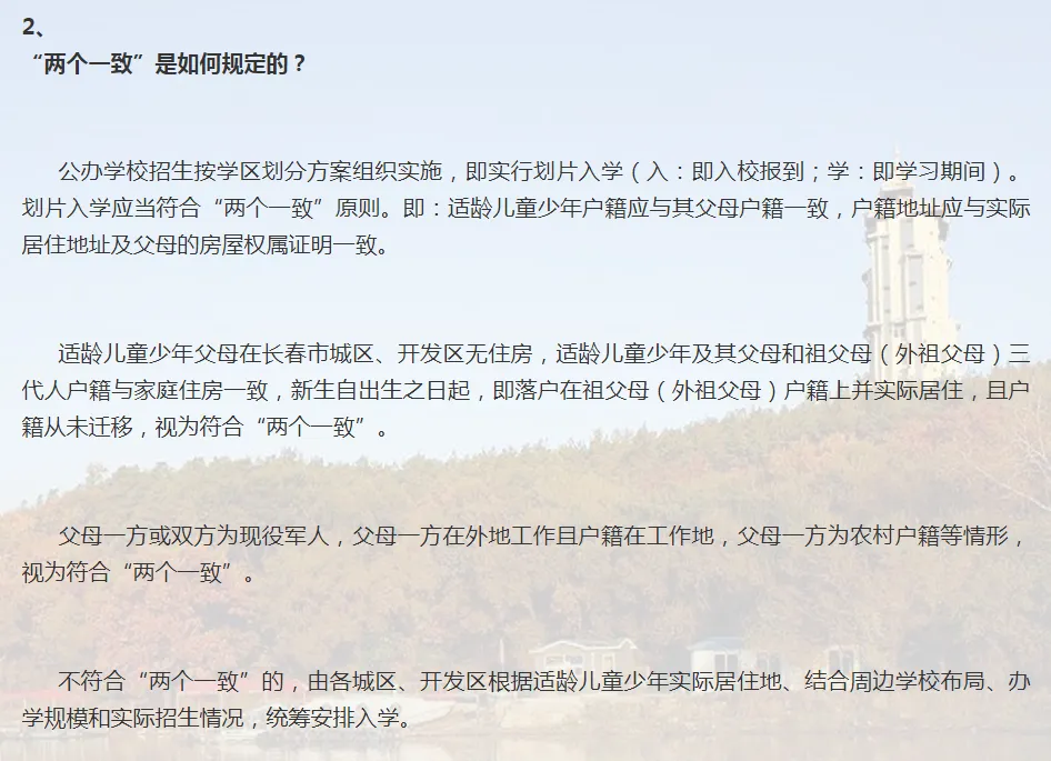 本市户口升学最需要注意的就是“两个一致”的相关问题,只要是长春有学区的公办学校都会审核“两个一致”!