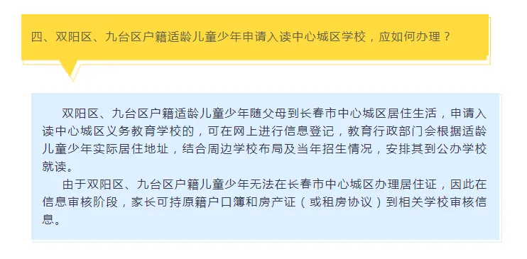 双阳区、九台区户籍适龄儿童少年随父母到长春市中心城区居住生活,可在网上进行信息登记,教育行政部门会根据适龄儿童少年实际居住地址,结合周边学校布局及当年招生情况,安排其到公办学校就读。