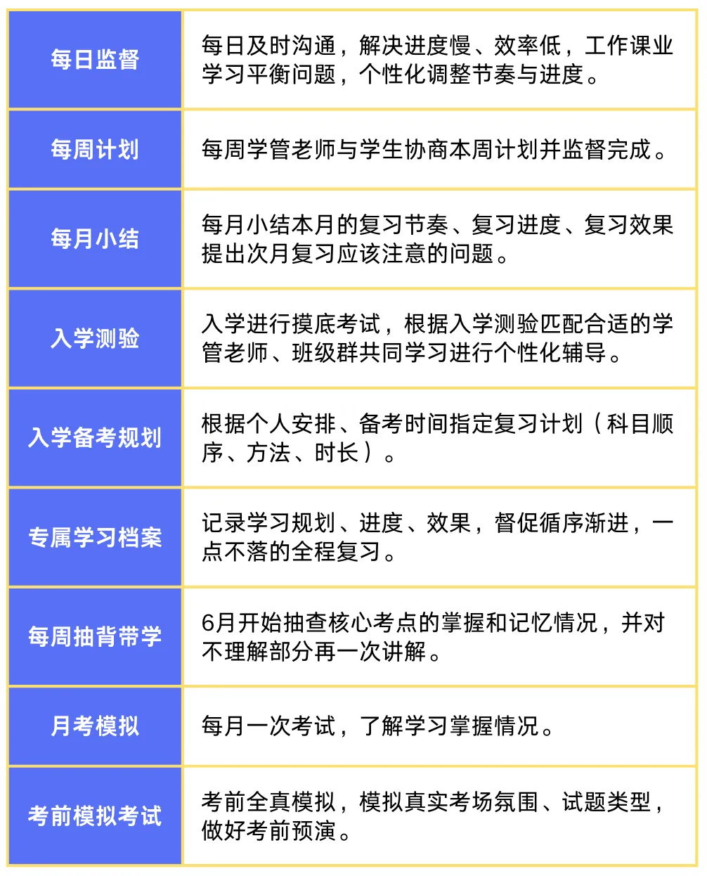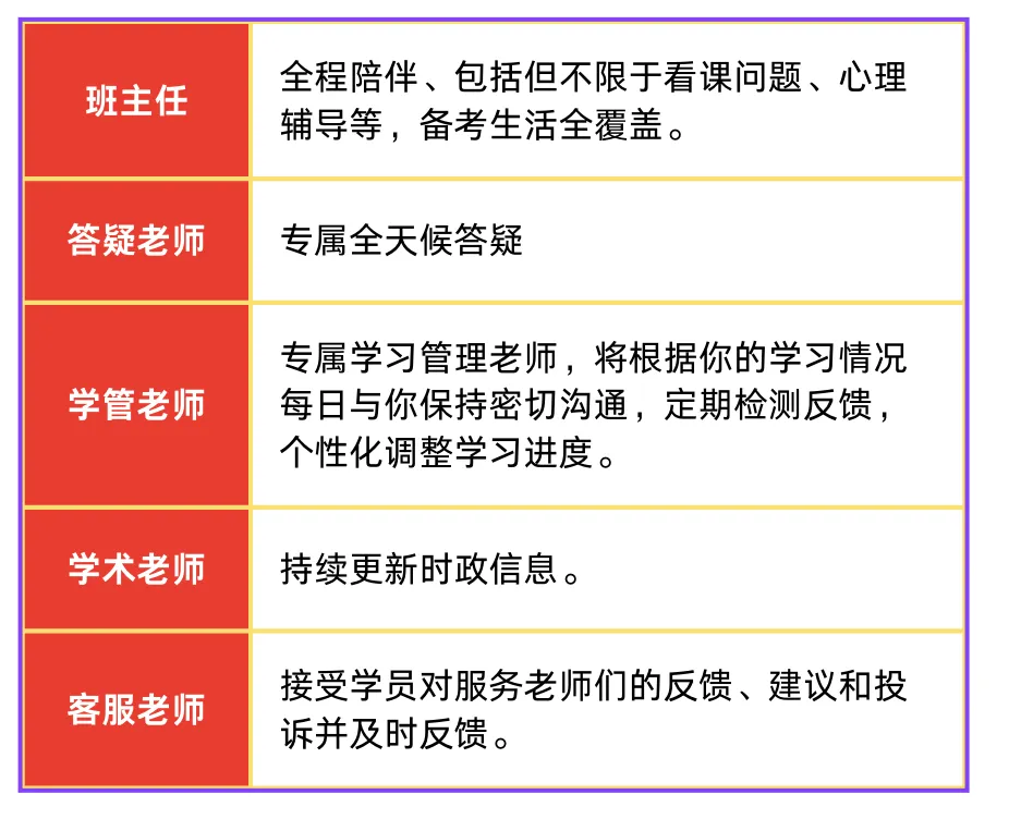 水木上岸为公共课设计的「五位一体」学员服务方案,开学创建5V1小群,多位老师服务一位学生,实现班主任全程陪伴、学管老师全程督导精准规划、答疑老师即时响应、学术老师深度教学、客服老师无忧保障的高效协同体系: