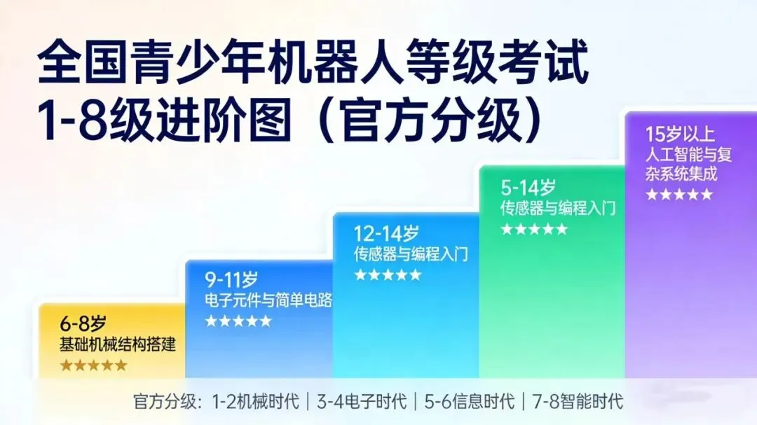先划核心结论:机器人等级考试1-8级分基础段(1-2级)、进阶段(3-4级)、高阶段(5-6级)、专业段(7-8级),难度逐级递增,低年级娃从1级起步最稳妥,贴合认知和动手能力,循序渐进不踩坑!
