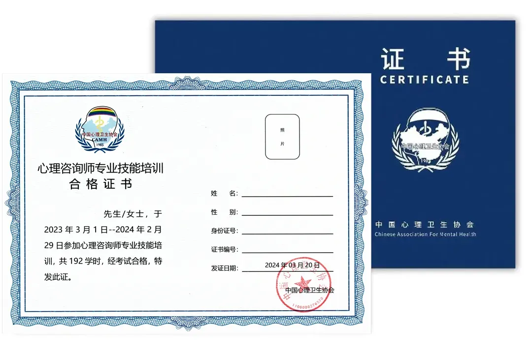 下图是中国心理卫生协会颁发的心理咨询师专业技能培训合格证书,相对来说是目前市面上可以考取的认可度、含金量较高的一个证书。