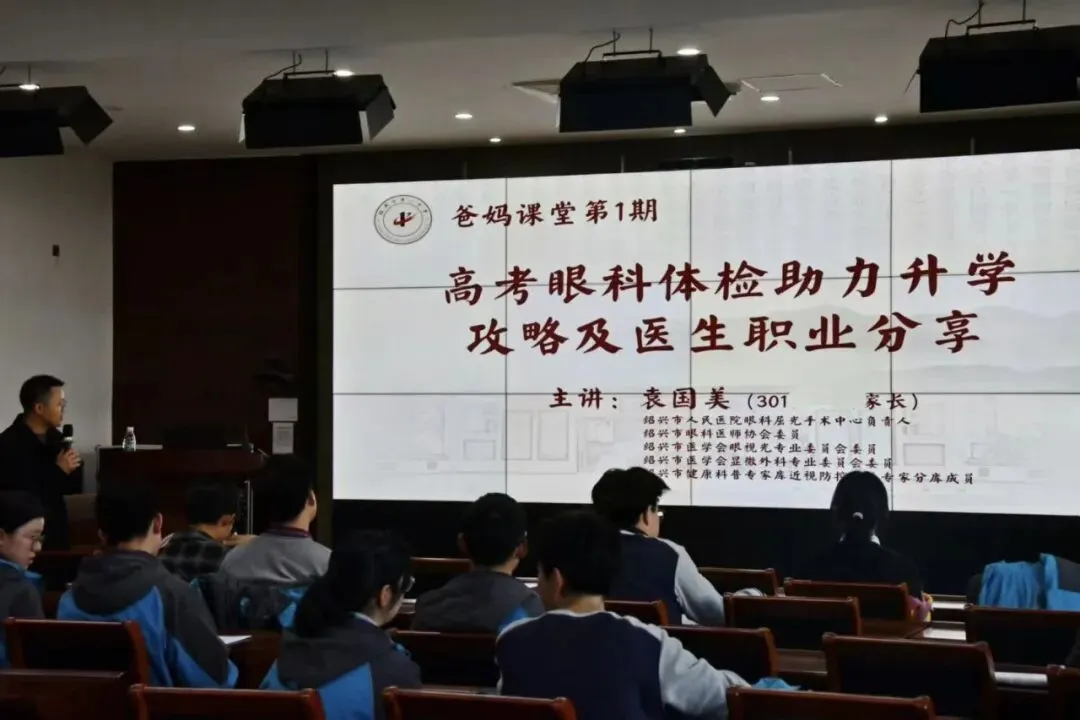为帮助同学们更好地进行生涯规划与专业选择,我校开展“爸妈课堂”系列活动,邀请来自各行业的优秀家长走进校园,分享职业智慧与行业经验。12月20日,我们有幸邀请到绍兴市人民医院眼科屈光手术中心负责人、我校学生家长袁国美医生,为同学们带来一场题为《高考眼科体检助力升学攻略及医生职业分享》的专题讲座。