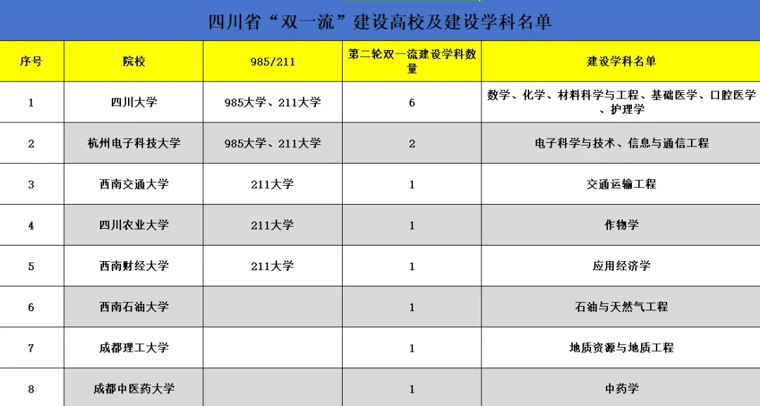 四川省共有8所双一流重点建设高校,其中有7所在成都,只有四川农业大学在雅安市。这里面还包括了4个“211工程”建设大学,分别是四川大学、西南交通大学、西南财经大学和电子科技大学。