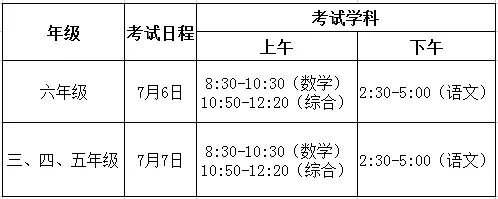 一、二年级无纸化测试(或综合练习)由学校在7月5日自行组织完成。