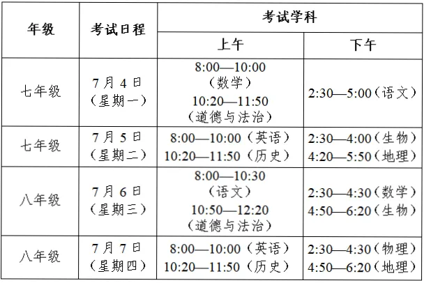 (一)小学一、二年级:语文、数学采取无纸化检测或以学生完成综合练习的方式进行。(二)小学三至六年级:语文、数学、综合科(含道德与法治、英语和科学三科)。(三)七年级:语文、数学、英语、道德与法治、历史、生物、地理。(四)八年级:语文、数学、英语、物理、道德与法治、历史、生物(会考)、地理(会考)。一、二年级由各学校在规定时间内自行组织检测;三至八年级各学科由区教育科技局统一组织安排检测;高一年级由市教育局统一组织安排联考,区教科局和各高中学校按要求配合做好相关工作;高二年级由各高中学校按区教科局招生办的要求抓好会考工作,并结合学校实际和所开设学科自行组织好期末检测。考试时间与科目安排