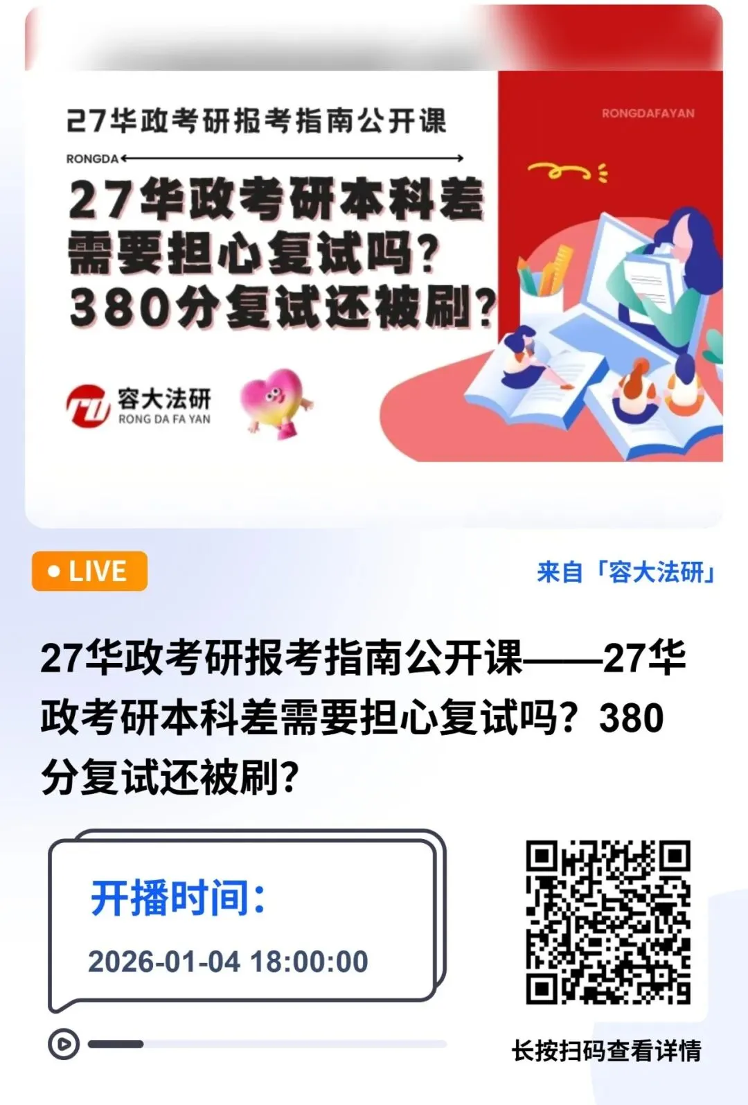 3.直播将会通过微信小程序“容大法研线上教育平台”、视频号、小红书同时直播,关注时间,及时收听。