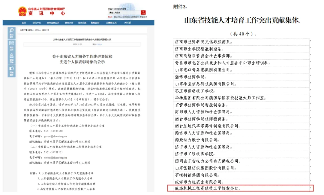 近日,从山东省人力资源和社会保障厅传来喜讯,我校教务处在全省人才培育工作先进集体评选中,被授予“山东省技能人才培育工作突出贡献集体”称号。这一殊荣是对我校多年来不断创新人才培养模式、全面落实立德树人根本任务的肯定,标志着我校人才培育工作迈上了新的台阶,进入了全省前列,更为2026年学校争先创优行动吹响了冲锋号,扣动了发令枪。