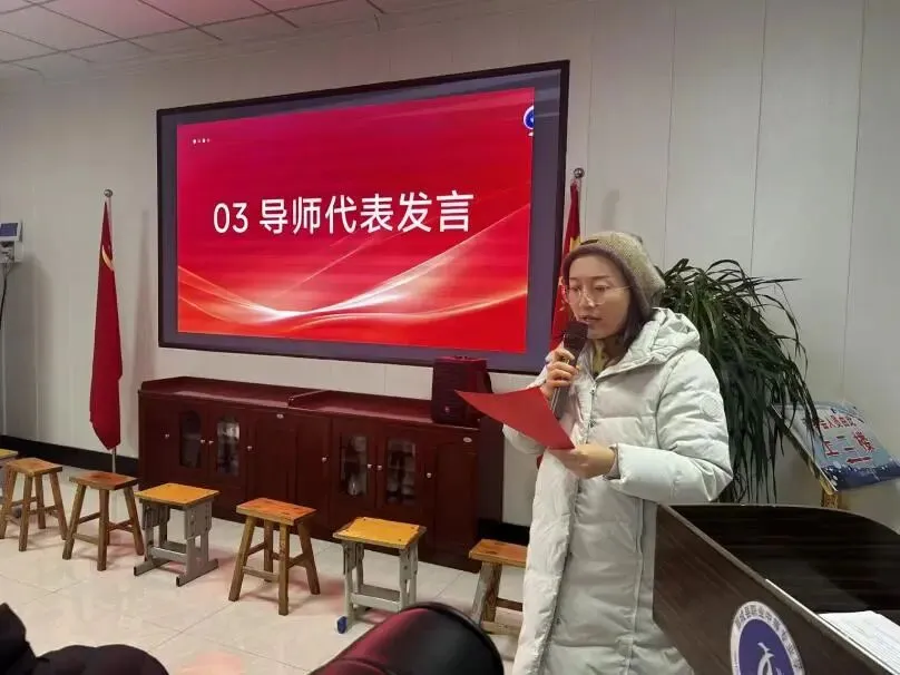 青年教师陈彦澍、张昭作为青年教师代表发言。两位老师深情表达了对学校搭建成长平台的感恩之情,以及对导师悉心指导的期待。两人分别结合自身成长经历与未来规划,表态将以导师为榜样,虚心求教、刻苦钻研,积极投身教育教学实践,努力早日成为一名优秀的教师。真挚的话语中,展现了青年教师蓬勃的朝气与坚定的信念。