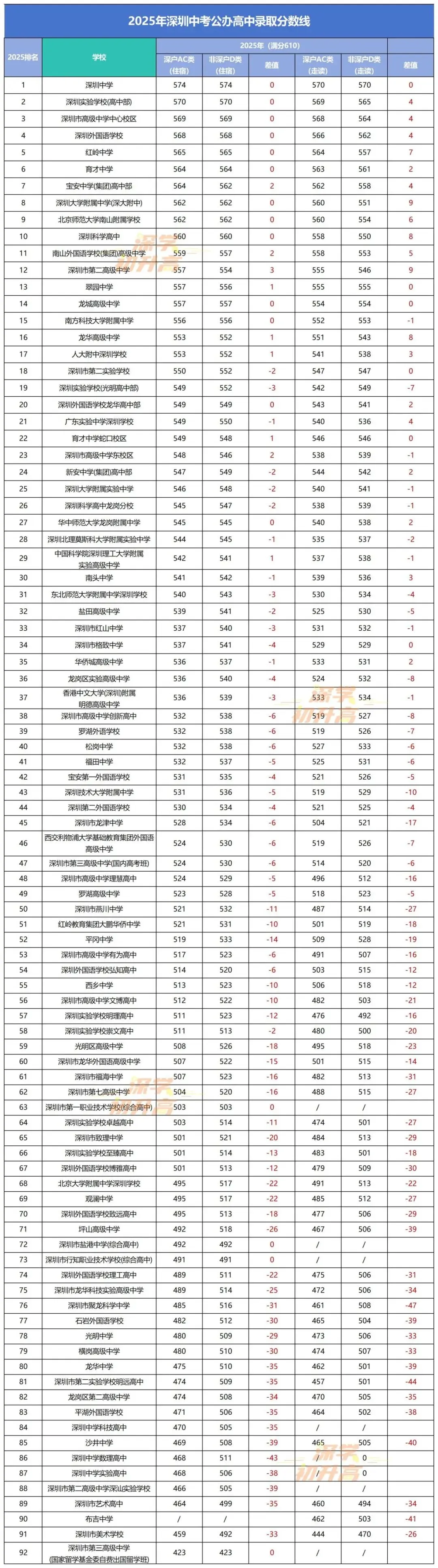 从2025年录取分数线对比来看,头部学校AC类与D类考生分数线差距较小,甚至还有深户录取线比非深户还高的情况。越到后面差距越大,深户会比非深户低不少分。