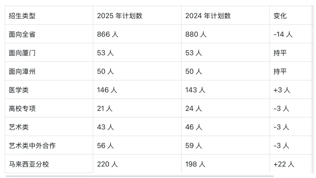 除了普通类专业组外,厦门大学还有多种特殊类型招生,其分数线呈现明显差异:物理类:最低 589 分,位次 16625;最高 596 分,位次 14083从数据可以看出,面向厦门和漳州的招生享有明显的地域优势,分数线比面向全省的普通类专业组低 5-10 分左右。医学类专业物理类最低 617 分,位次 7670,相比普通类专业组也有一定的分数优势。而马来西亚分校的分数线明显较低,物理类最低仅 589 分,历史类 588 分,为分数相对较低但又想上 985 高校的考生提供了另一种选择。招生计划的结构性调整