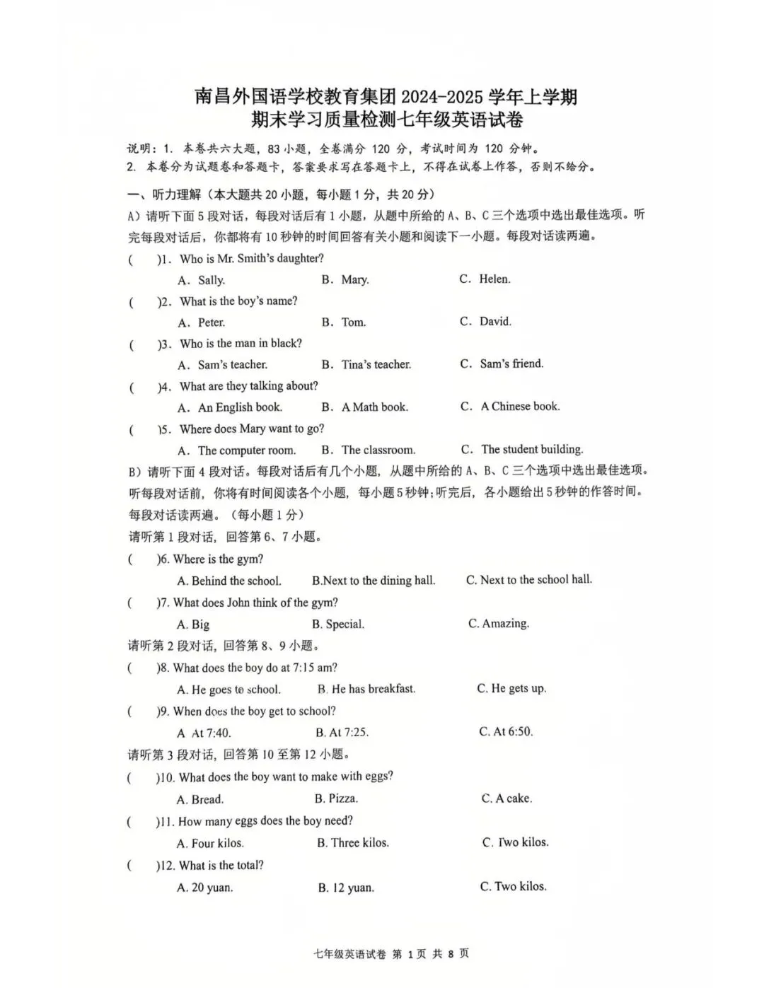 7年级试卷部分展示