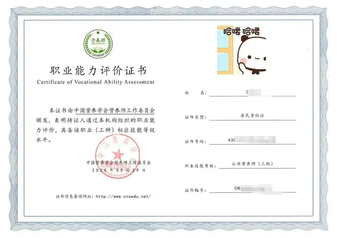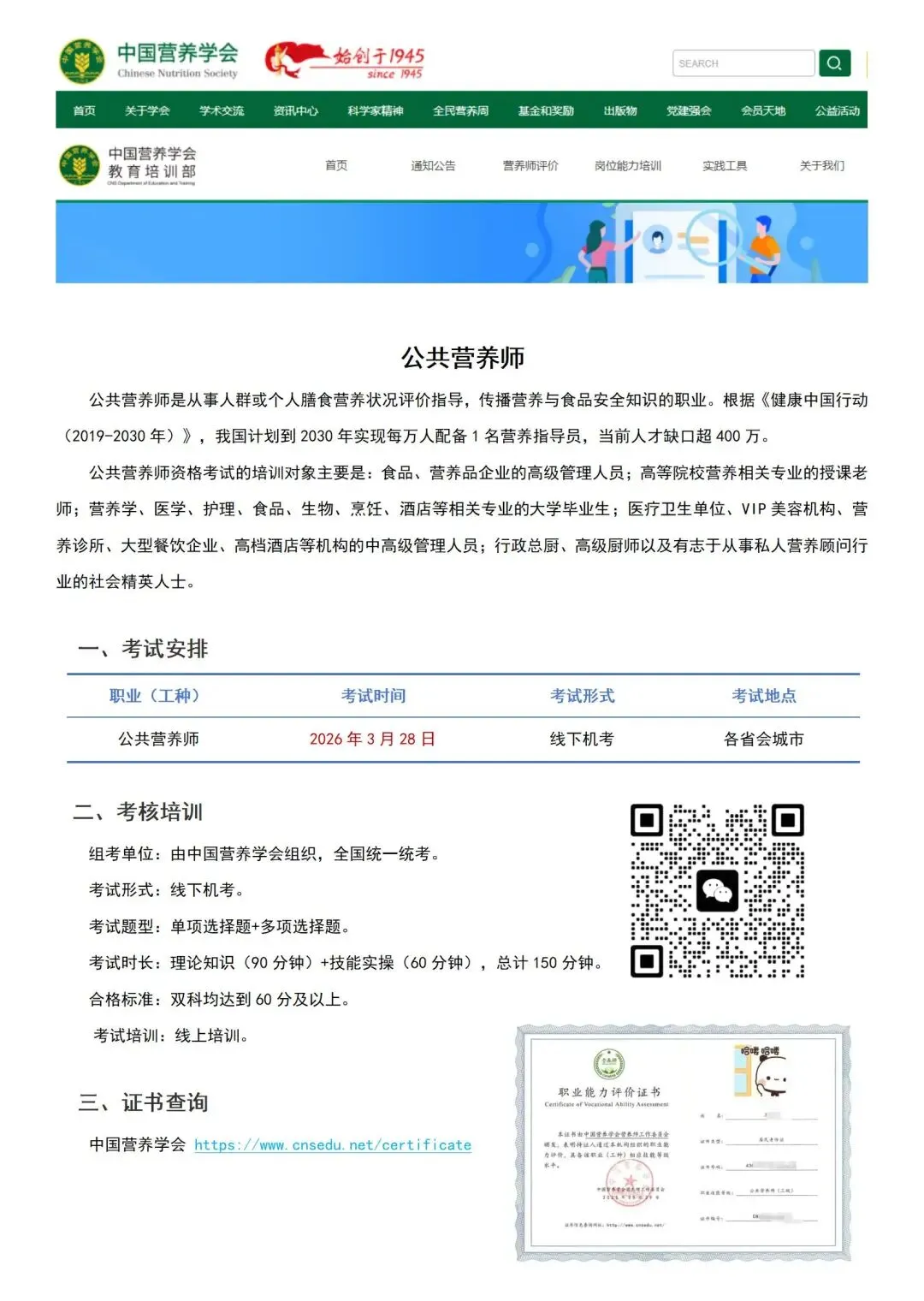 -通过考试者将获中国营养学会颁发的《公共营养师》职业能力评价证书,证书行业认可度高,全国通用,免注册。