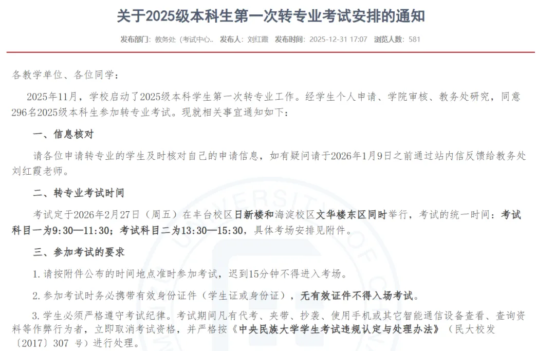 考试定于2026年2月27日(周五)在丰台校区日新楼和海淀校区文华楼东区同时举行。