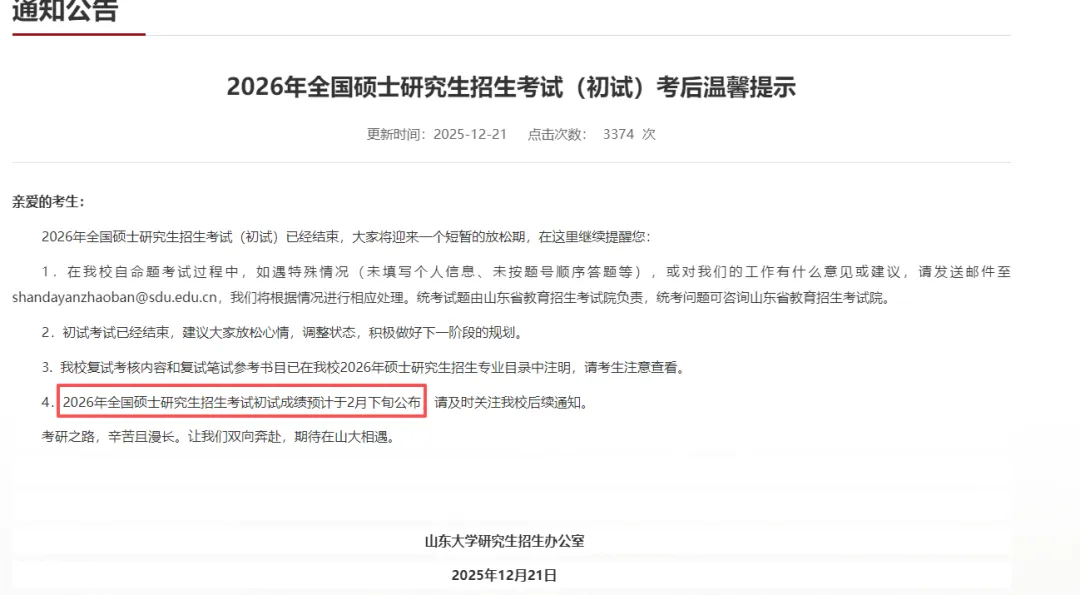 山东大学研招网官网发布《2026年全国硕士研究生考试(初试)考后温馨提示》文中指出,初试成绩查询时间为2025年2月下旬。