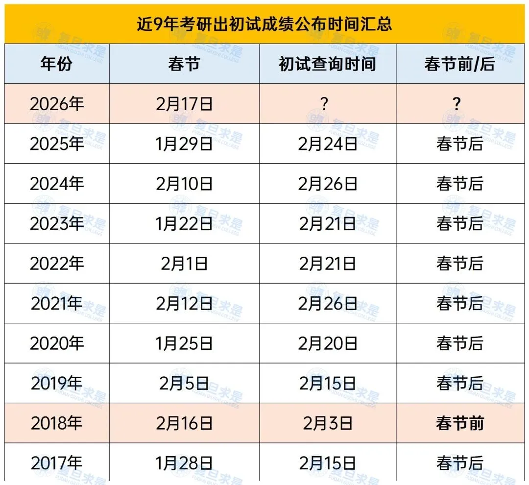 2026年春节时间和2018年非常接近,2018年初试成绩在春节前公布,2026年也会如此吗?小编预测大概率还是会在春节后公布,因为2025年考研成绩查询时间为2月24日,2026年春节假期也在在2月23日截止,且山东大学等多所院校和单位公告也显示2月下旬开始查询成绩。所以2026考研成绩公布应该在2月24日-26日之间。
