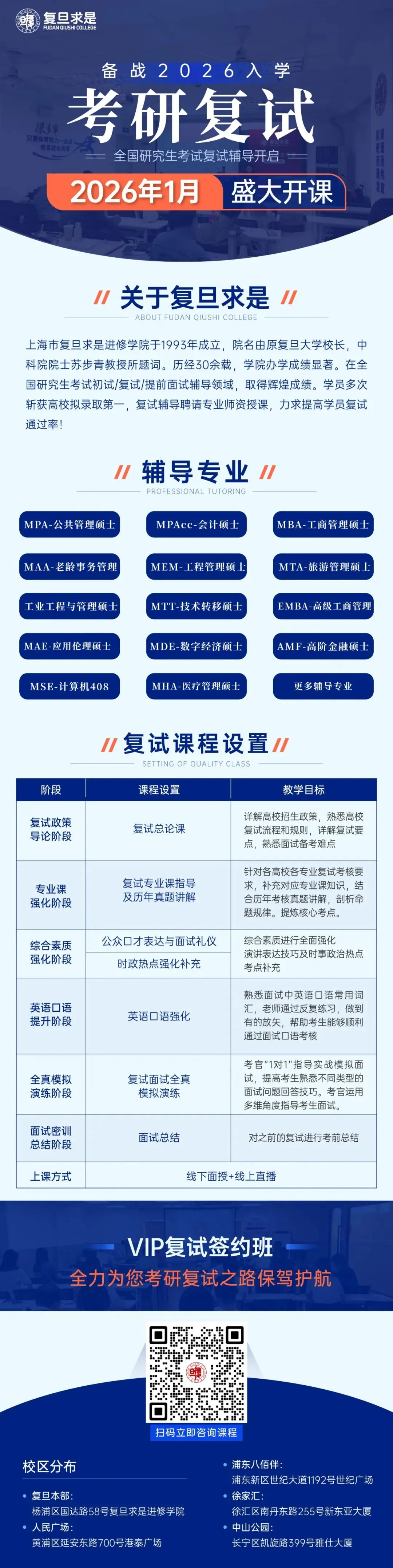 所以复试在录取环节显得十分重要。复旦求是针对2026考研开设针对性强的复试辅导课程,实行个性化定向辅导、另外加以多年积累的培训经验和科学设置课程,力求帮助广大考生顺利通过复试;