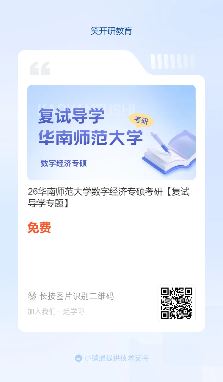 别慌!为帮大家精准破解复试难题,高效备战上岸,我们重磅推出【26数字经济专硕考研各院校复试导学课】!更重要的是——第一节课对外公开免费听,零门槛解锁复试核心攻略,帮你少走99%的弯路!