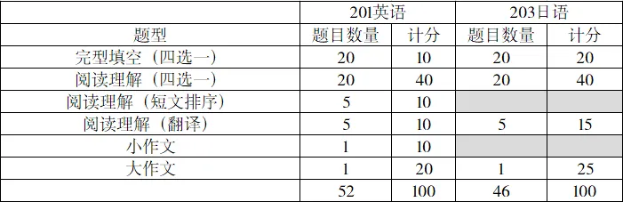 阅读理解+翻译:主要考察理解大意、推测词义、理解作者意图、观点等;分A、B两节。A节4篇阅读,总量4000字符左右,每篇5小题,每小题2分,共40分。B节1篇1000字符左右文章,划线部分日译汉,共5句,每题3分,共15分,共计55分。