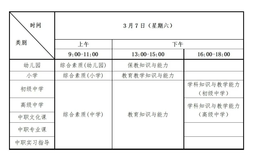 答:全国统一考试日期2026年3月7日,各类别考试科目与时间安排如下: