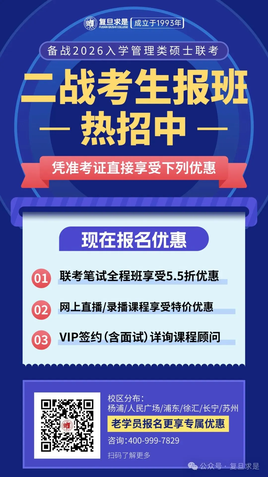 如果你决定二战,应尽早准备目标院校的提前面试,到时候12月联考笔试压力就会大大减少!复旦求是针对老学员或者二战考生,现在实行辅导报名大幅优惠,详情可致电400-999-7829;