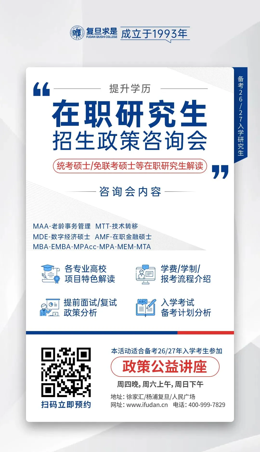 如果你期待2025年入学,还有一些免联考硕士项目,复旦求是可以帮助你争取2025年一波入学机会;项目均为教育部认可!可参与学历认证。详情可扫码预约咨询!