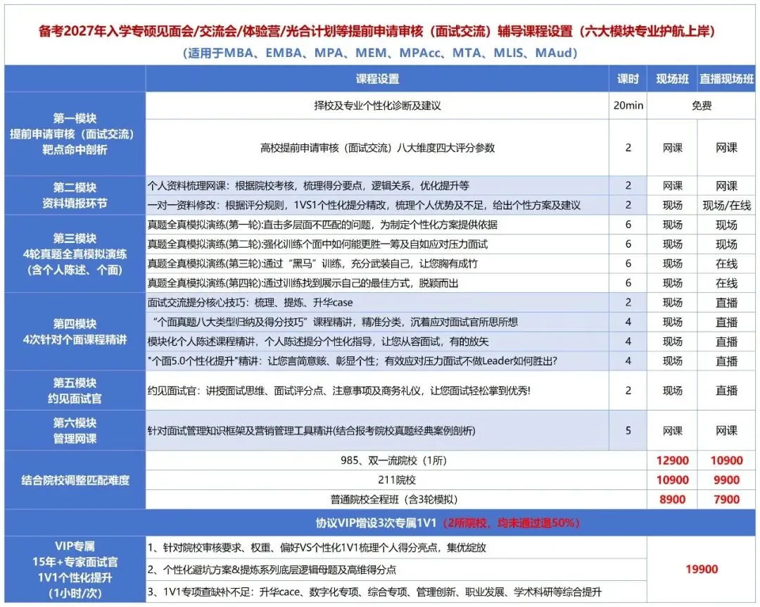 历年培训管理类联考专业硕士如:MBA、EMBA、MPA、MEM、MPAcc等提前面试(或交流会)及复试面试通过率99%+,联考笔试通过率96.9%+,校友推荐率40%+,高清网课及直播遍布全国。