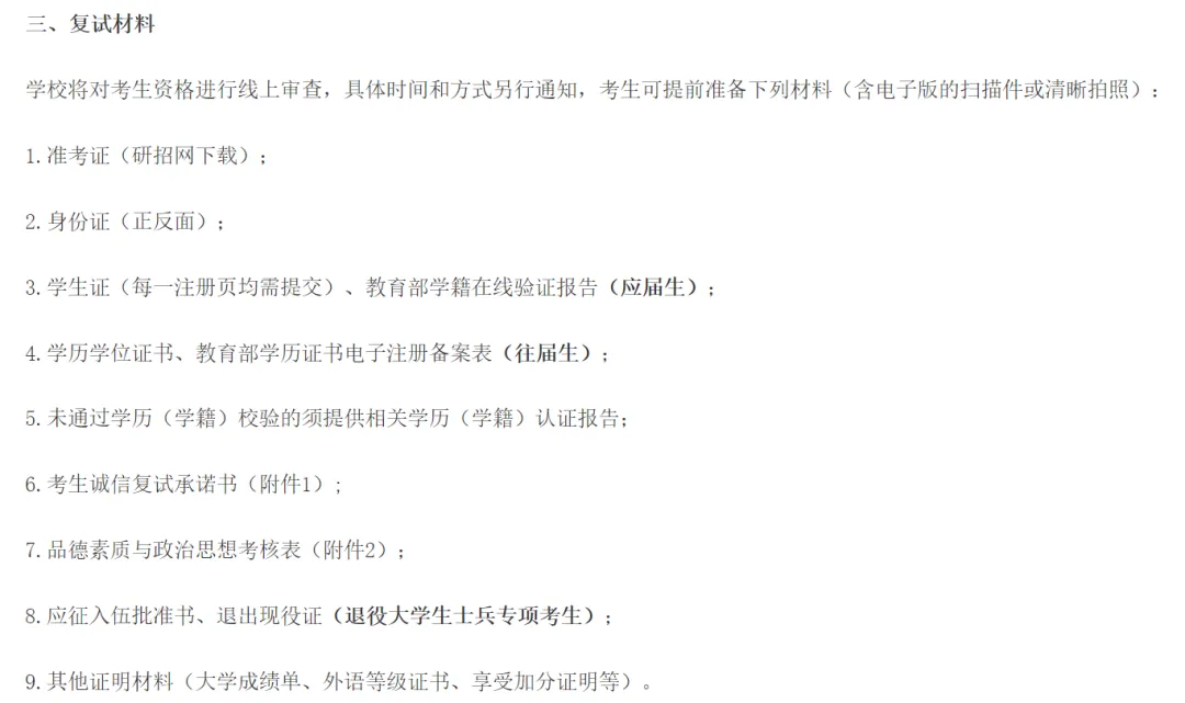①身份证明:初试准考证、本人有效身份证原件及复印件、毕业证书和学位证书(应届生带学生证)原件或复印件;